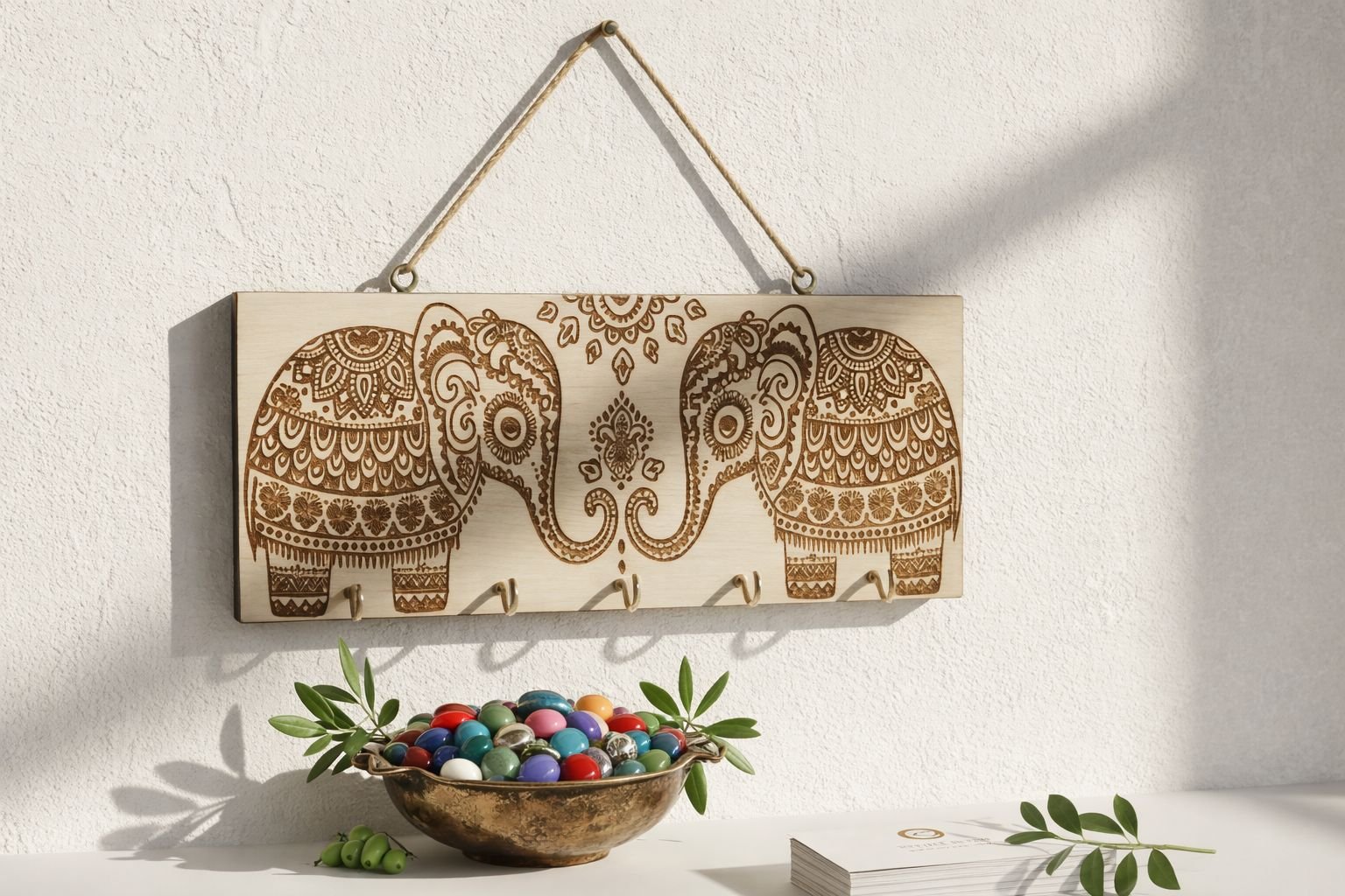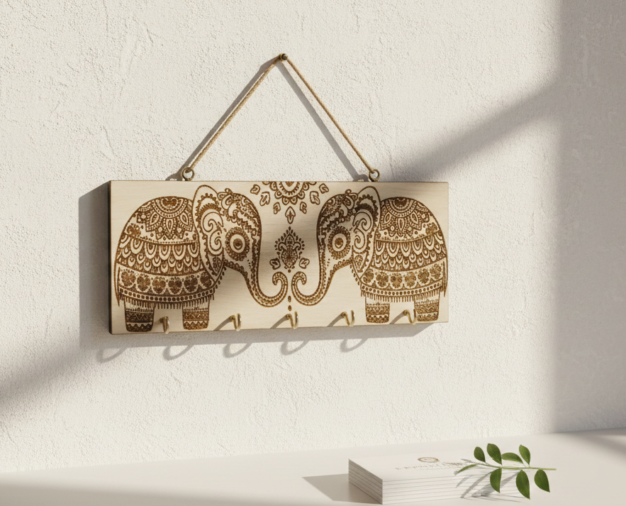 The Harji Daaji—Gaja Heritage Key Rail features two majestic, laser-etched elephants adorned with intricate mandala patterns on a natural wood base. This soulful wall-mounted organizer blends traditional Indian artistry with modern utility, providing a beautiful and symbolic home for your keys and daily essentials.