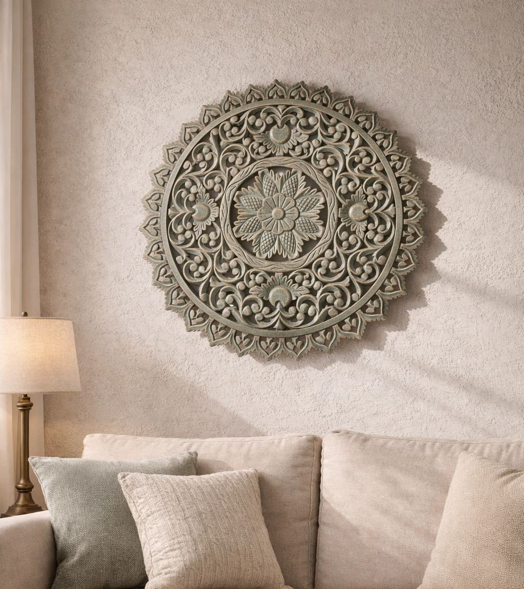 The Harji Daaji—Old World Floral Carving is an exquisite wall medallion featuring a deeply textured, hand-carved floral mandala with a weathered patina finish. This timeless statement piece captures the essence of heritage craftsmanship, adding a layer of soulful, rustic elegance to any gallery wall or living space.