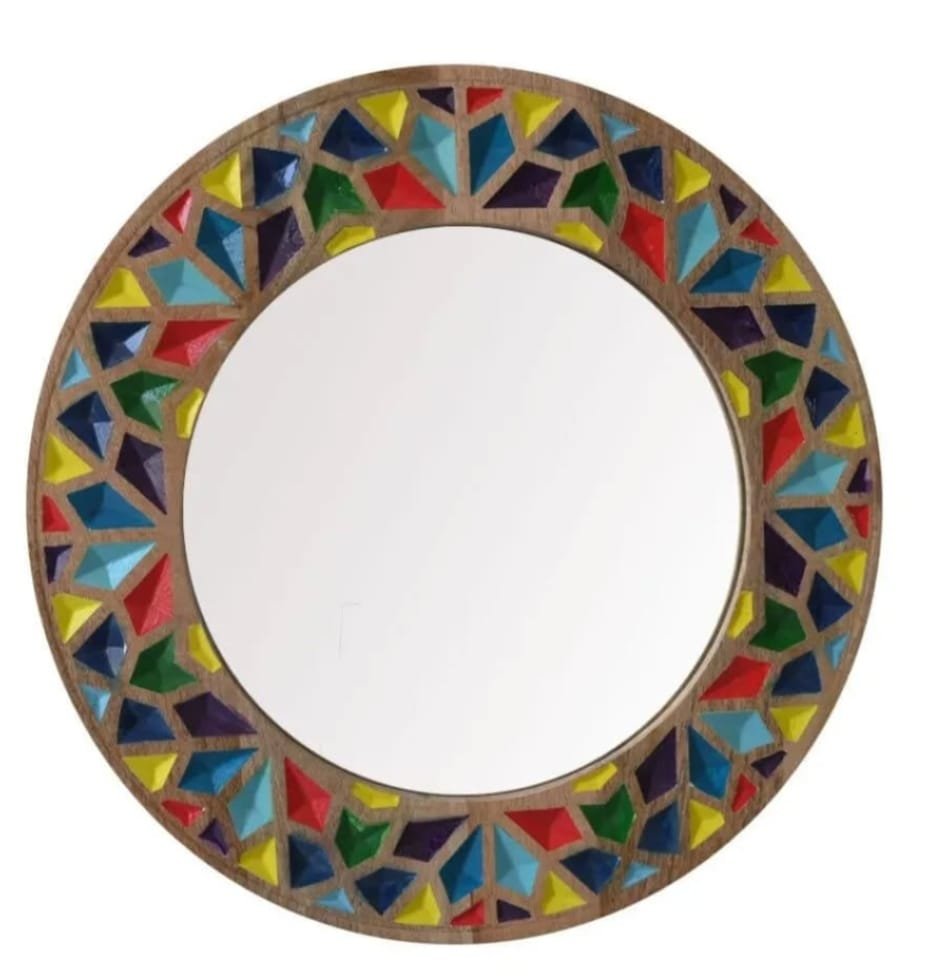 The Harji Daaji: Prism Edge Mirror is a masterful blend of traditional woodcraft and bold, geometric artistry. Featuring a handcrafted frame inlaid with vibrant, multi-faceted resin prisms, it serves as a stunning focal point that captures light and color from every angle. Elevate your space with this unique, bohemian-inspired statement piece that perfectly balances modern edge with artisanal warmth.