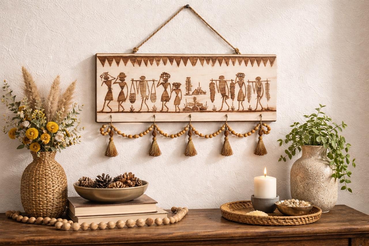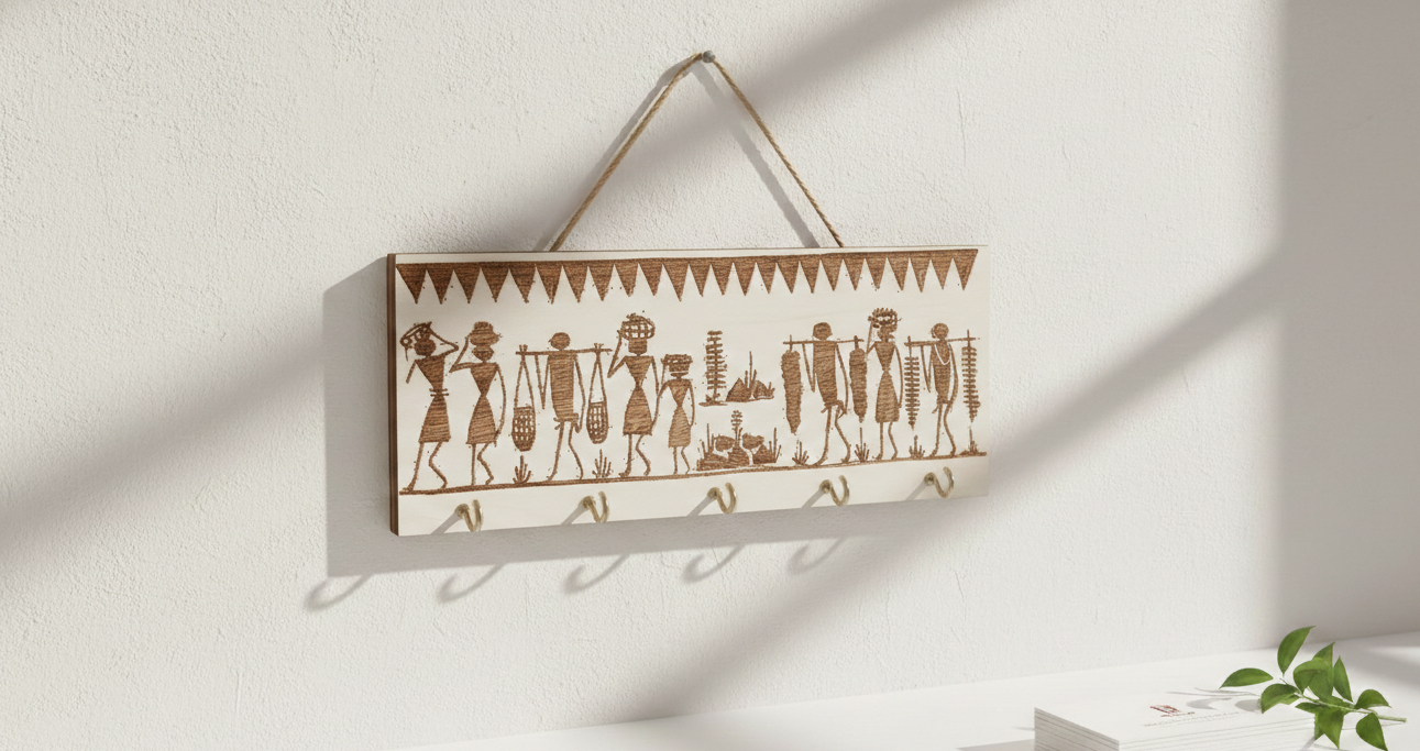 The Harji DaajiβWarli Harvest Hanger celebrates the spirit of community with its intricate laser-etched depiction of traditional tribal life and rhythmic movement. This functional work of art serves as a soulful entryway organizer, combining ancient storytelling with modern utility to keep your keys and daily essentials in one beautiful place.